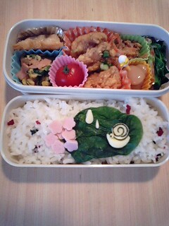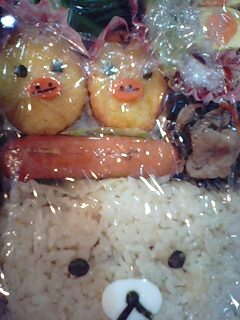 リラックマの方は、一泊ニ日の学校行事中に食べる為、捨てれる紙箱弁当に詰め、崩れないようにラップをしています。